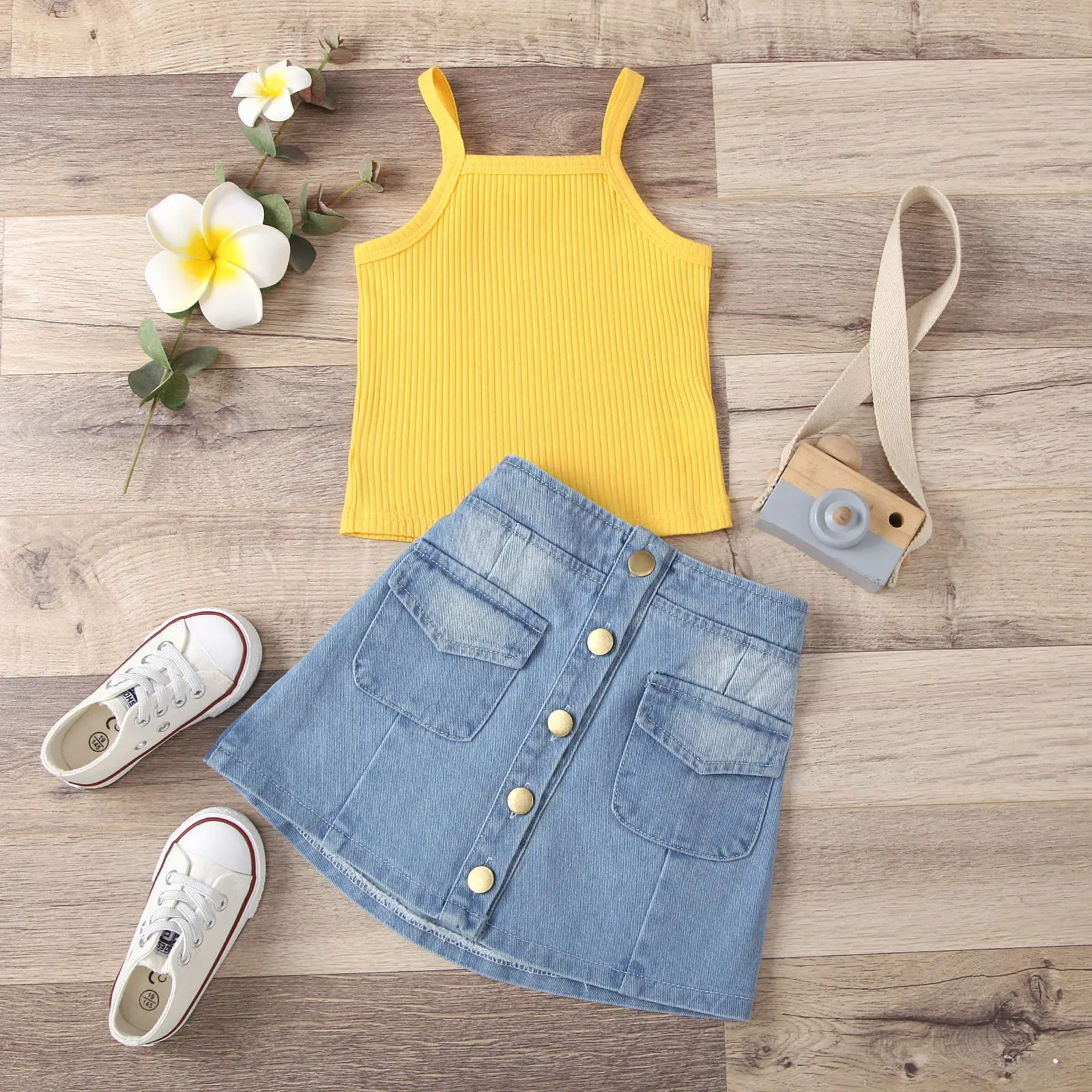 Product Name | 2021 New Infant Kid Girl Bright Color Sleeveless Tank Top + Denim Skirt 2 Pcs Clothing Set 1-5 T |