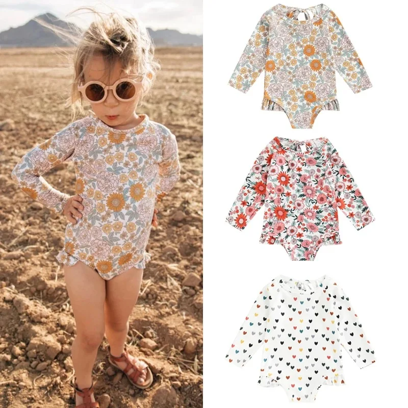 item | 1-6T Toddler Girls Summer Casual Long Sleeve O Neck Floral Print Bodysuit Swimsuit Heart Flowers Kids Girl Swimwear |