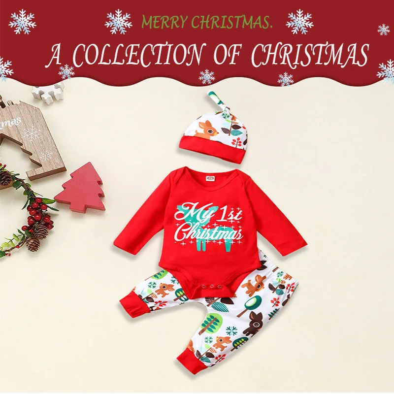 Conyson Baby Christmas Winter Organic Cotton Long Sleeve 3Pcs unisex Romper Jumpsuit Newborn Baby Girls Clothing Set For Toddler