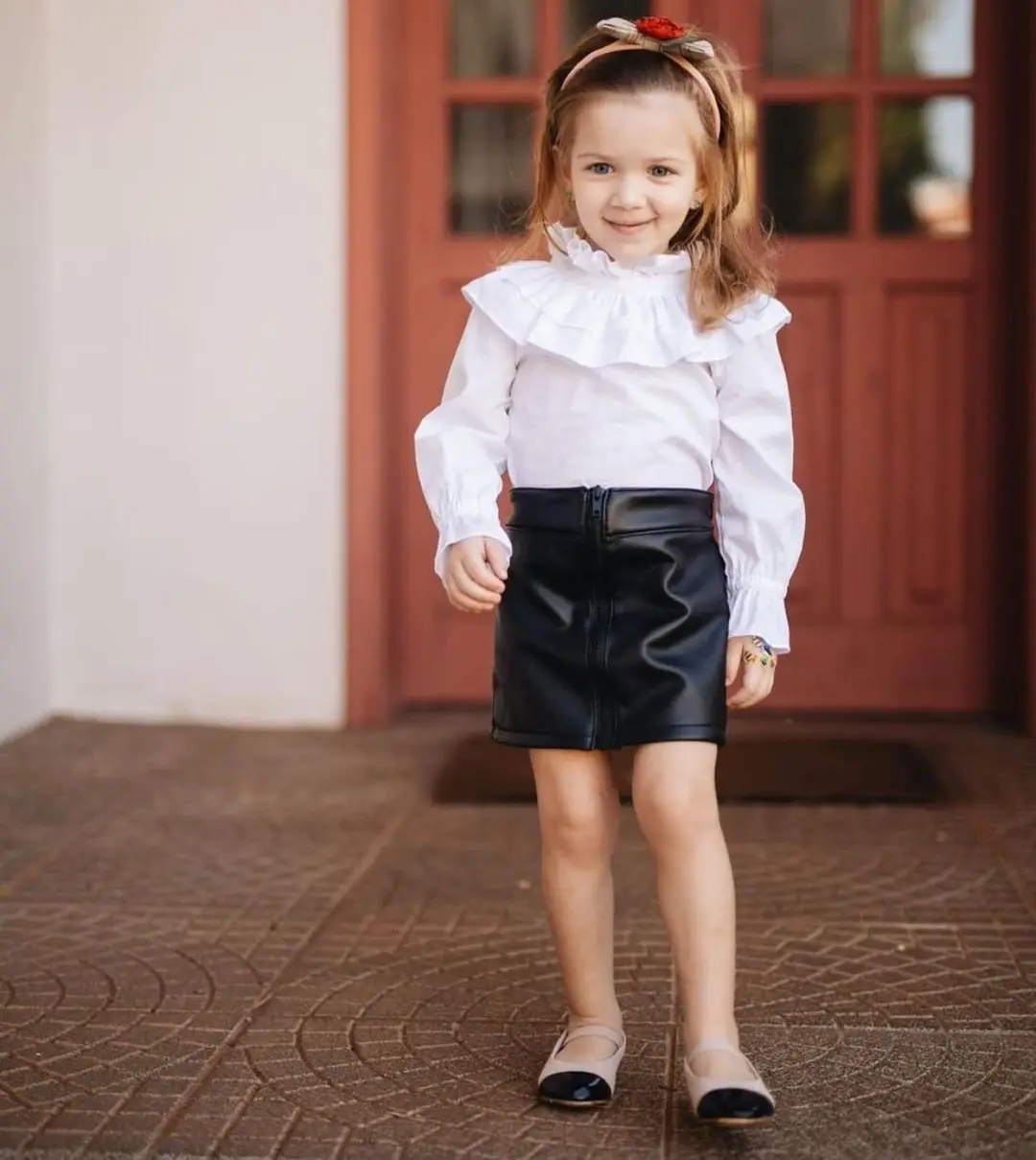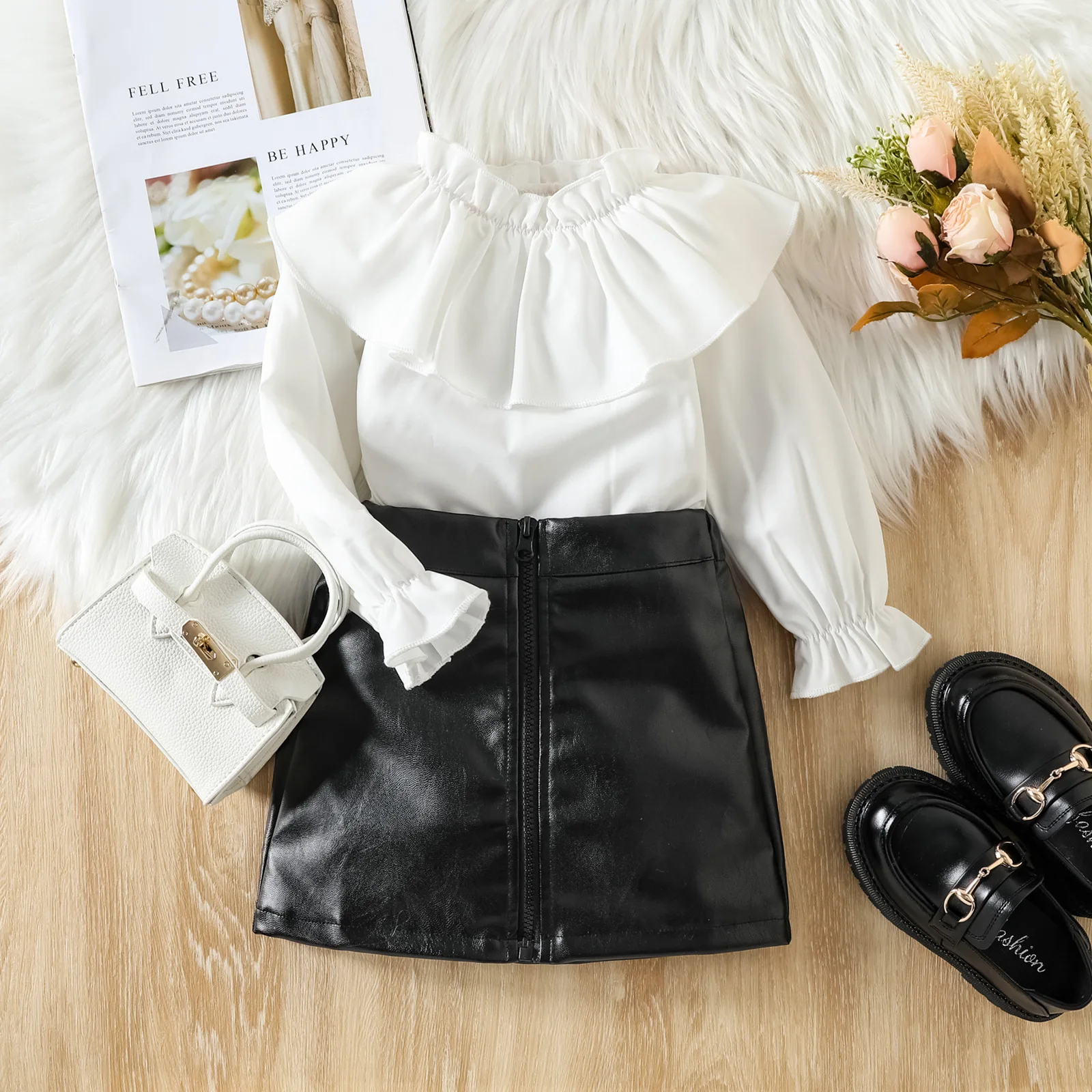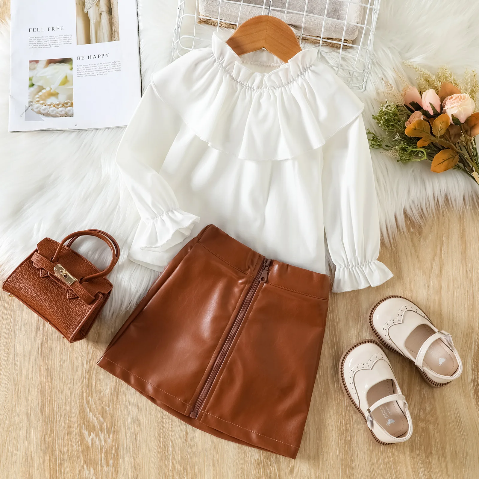 Conyson Cuter Kids Girl Skirts Sets Flower Ruffle Princess Shirts Zipper PU Skirt Two Piece Littler Girls Clothing Dress Sets
