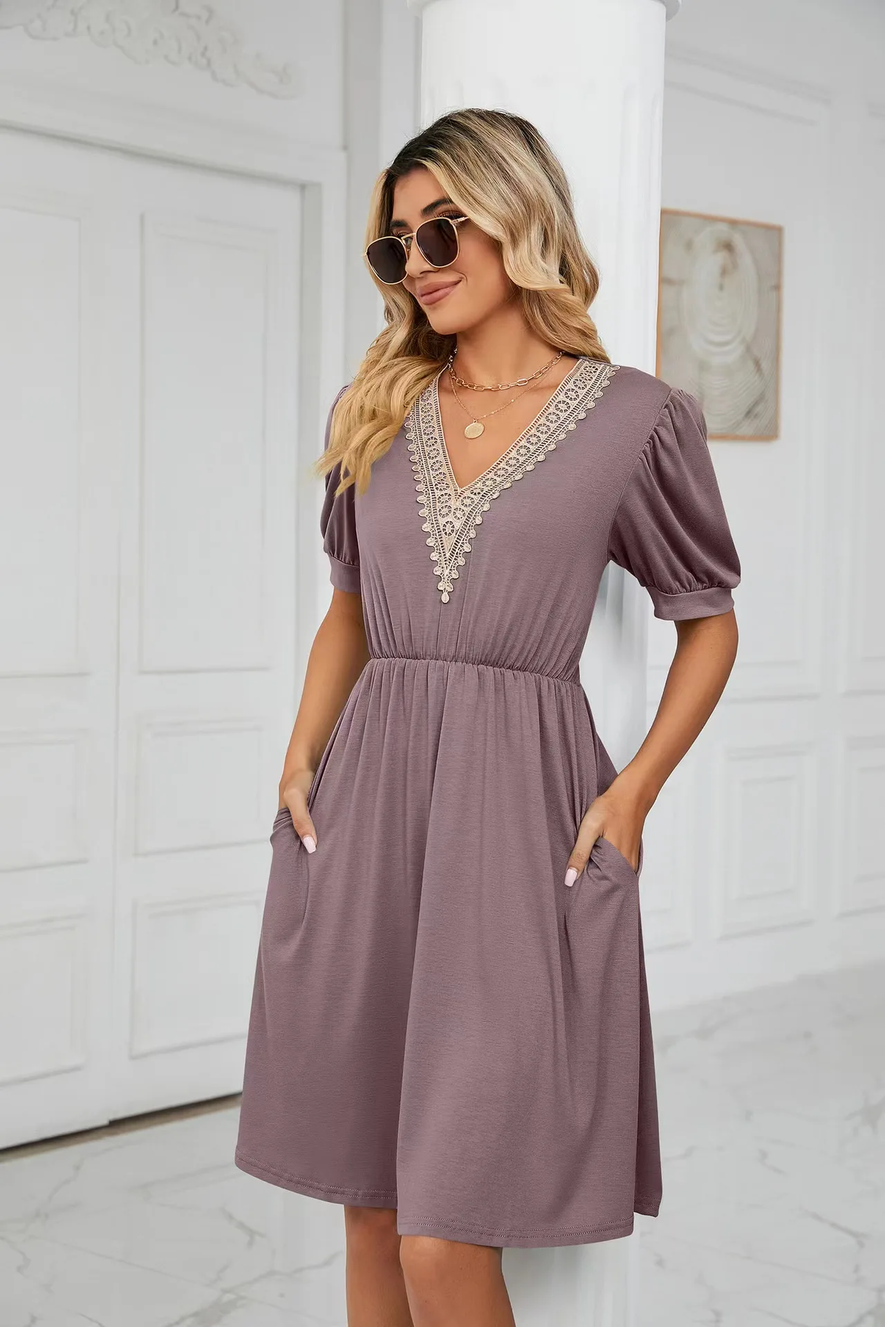 Product Name | Summer Plain V Neck Splicing Design Short Sleeve With Pockets Tight Sexy Dresses Women |