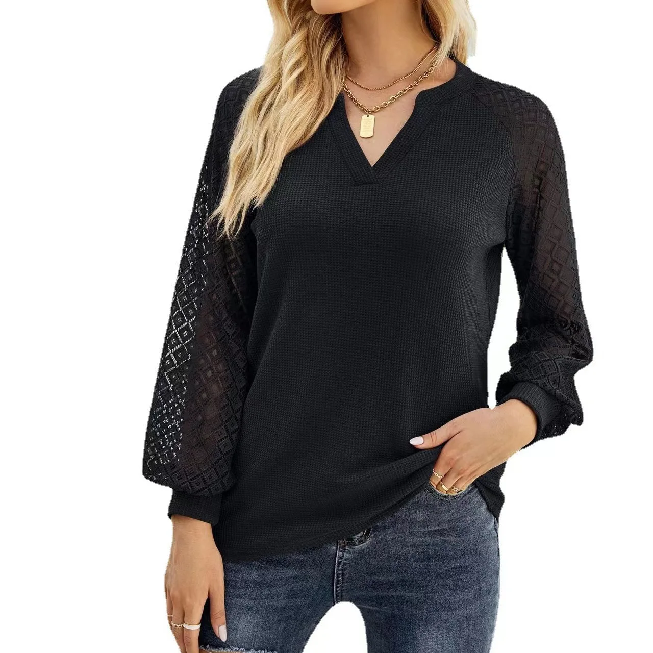 Product Name | Waffle Lace Splicing Raglan Sleeve V Neck Quality Designer White Plain T-shirt Women |