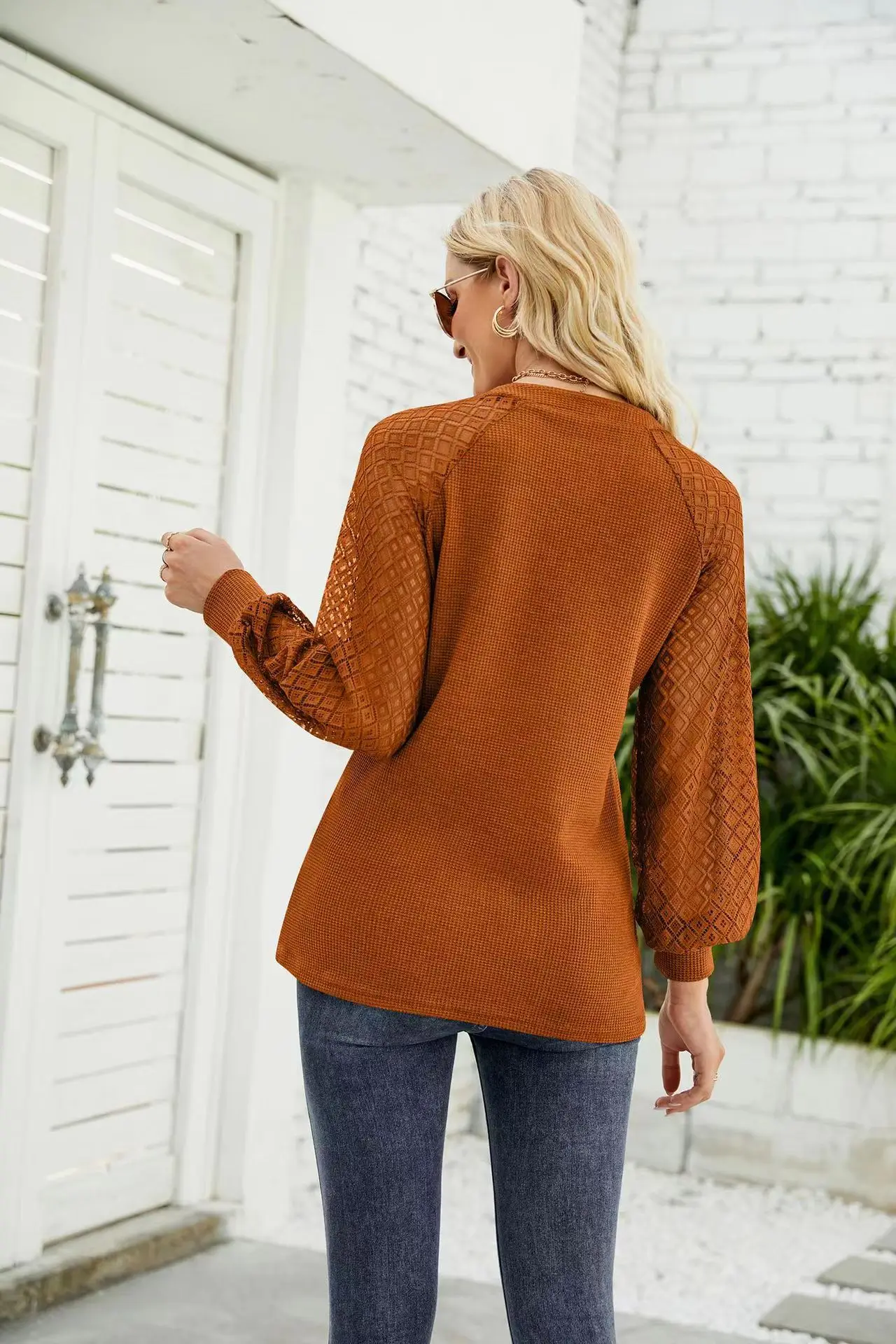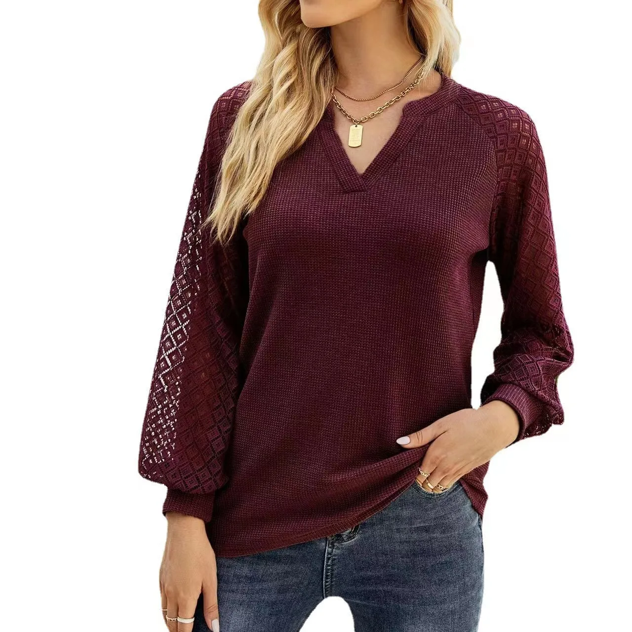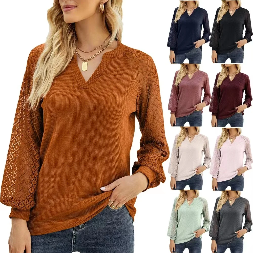 Conyson New Arrivals Spring Winter Waffle Lace Splicing Raglan Sleeve V Neck Quality Designer White Plain T-shirt Women