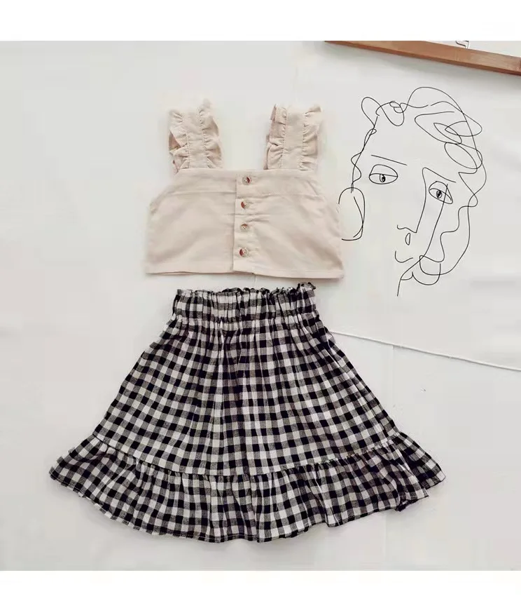 Conyson New Designer Hot Sale Suspenders Solid Top Plaid Skirt Kids casual Summer 2Pcs Short Set Little Girls