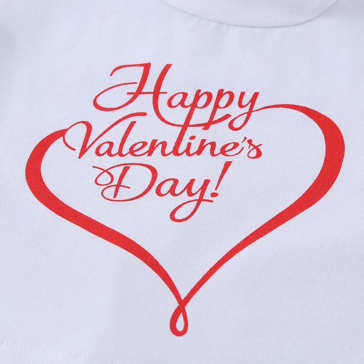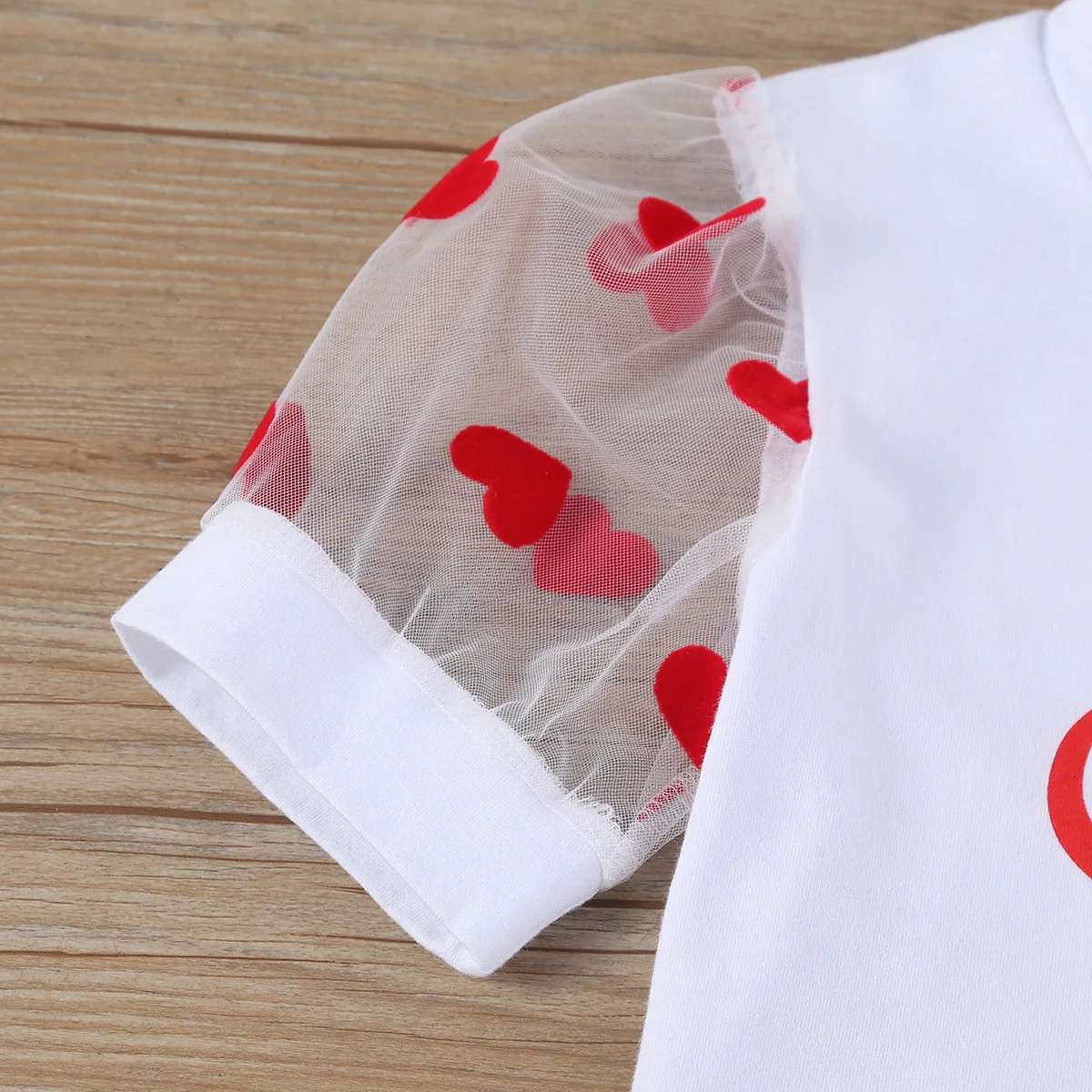 Conyson New Summer Valentines Days Kids Toddler Girls 2Pcs Clothes Sets Heart Letter Mesh Puff Sleeve T-Shirts+Bowknot Skirt Set