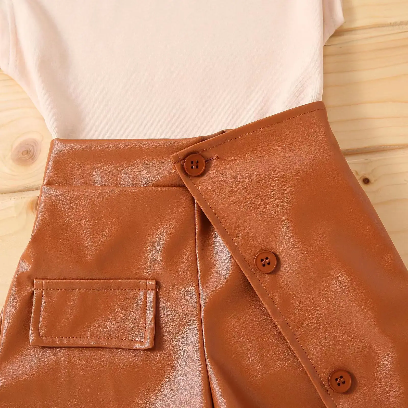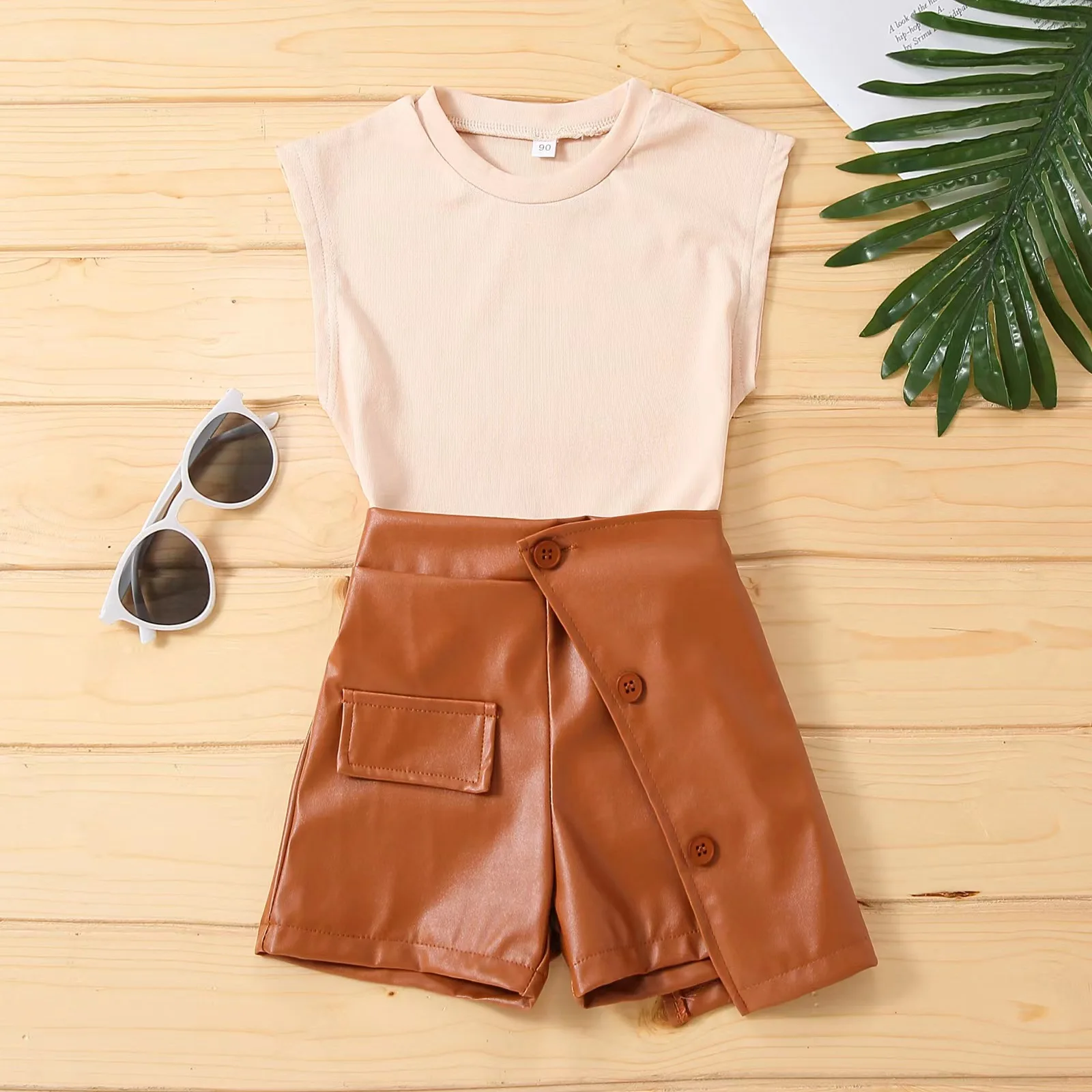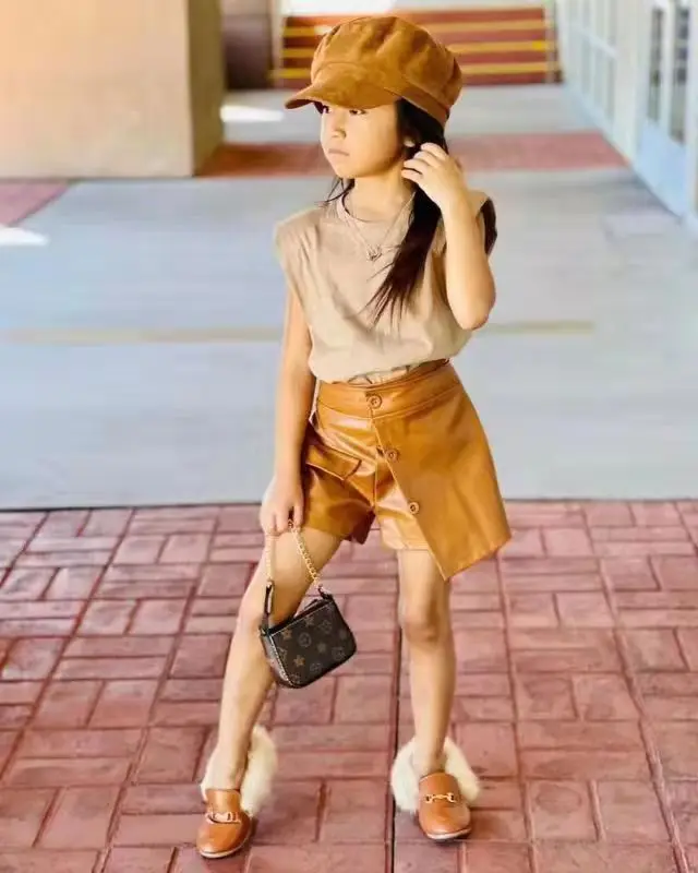 Conyson Summer Brown 1-6Y Littler Girls Clothes Set Cotton Sleeveless Vest Tops PU Leather Shorts Skirts Two Pieces Casual Suits
