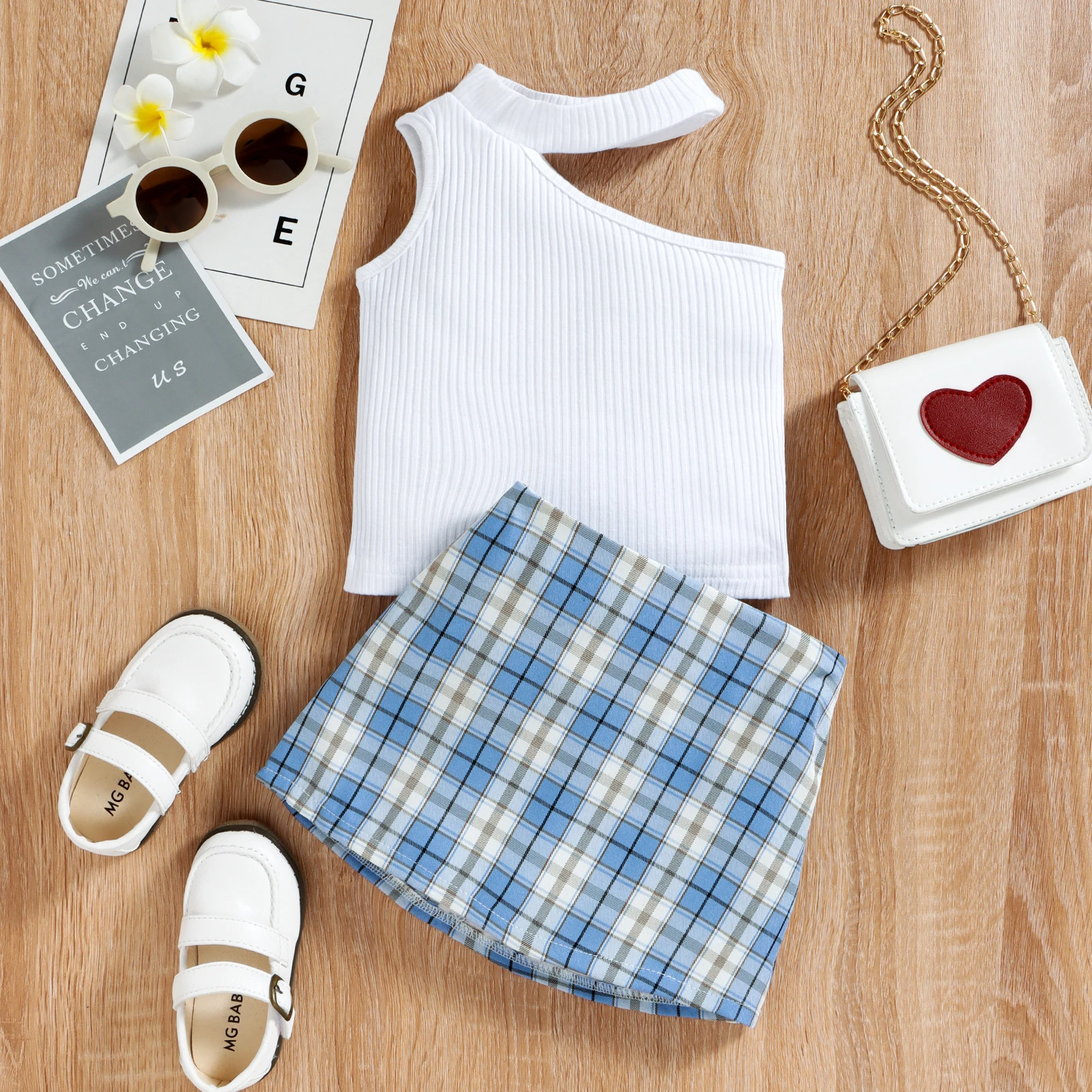 Product Name | Conyson Wholesale Fashion Baby Girls Clothes Set Sleeveless Ribbed Hollow Shoulder Vest Tops+Plaid Printed A-Line Skirt Outfit |