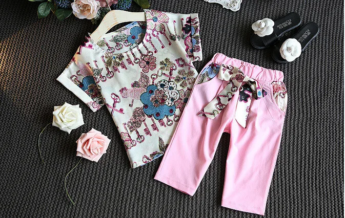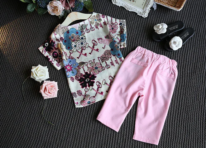 Flower Pattern New Design Boutique Toddler Kids Children Girls Clothes Summer Short Sleeve Suit Sets