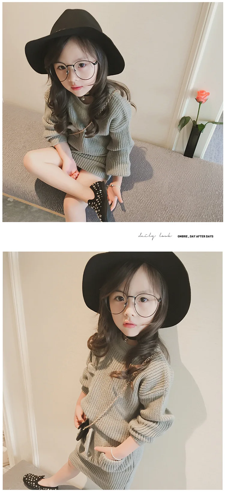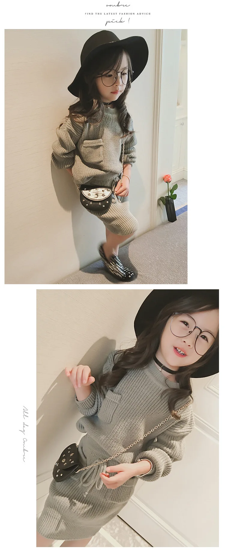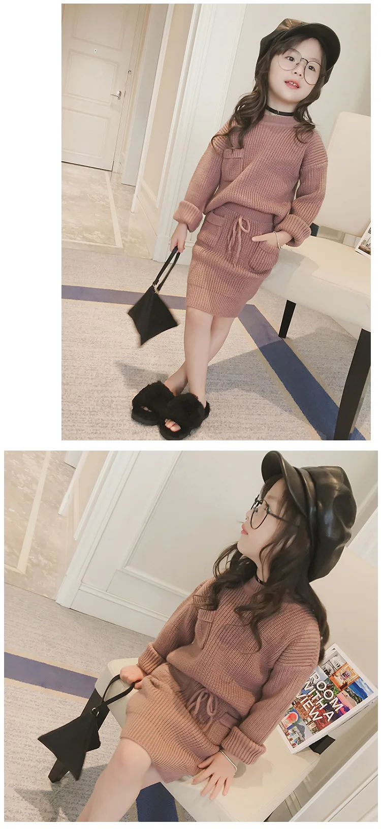 High Quality 2 Colors Cotton Knitted Sweater Top And Skirt Girls Two Piece Sweater Skirt Set