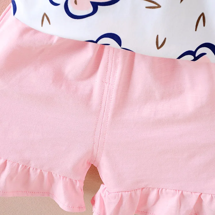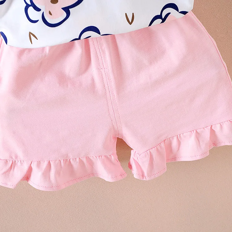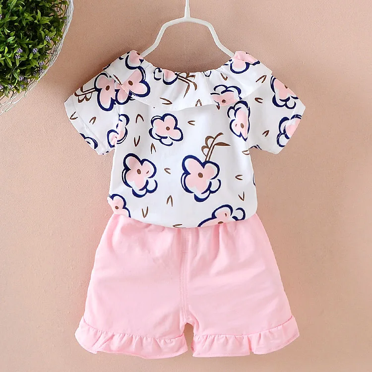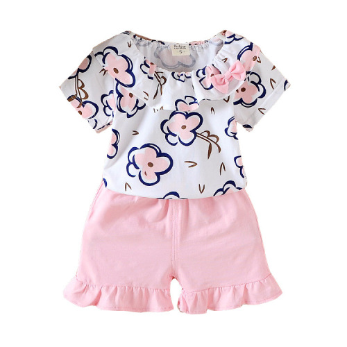 High Quality 2021 summer children popular short sleeve o-neck bowknot baby girls print tops with kid pure color short pants 2pcs
